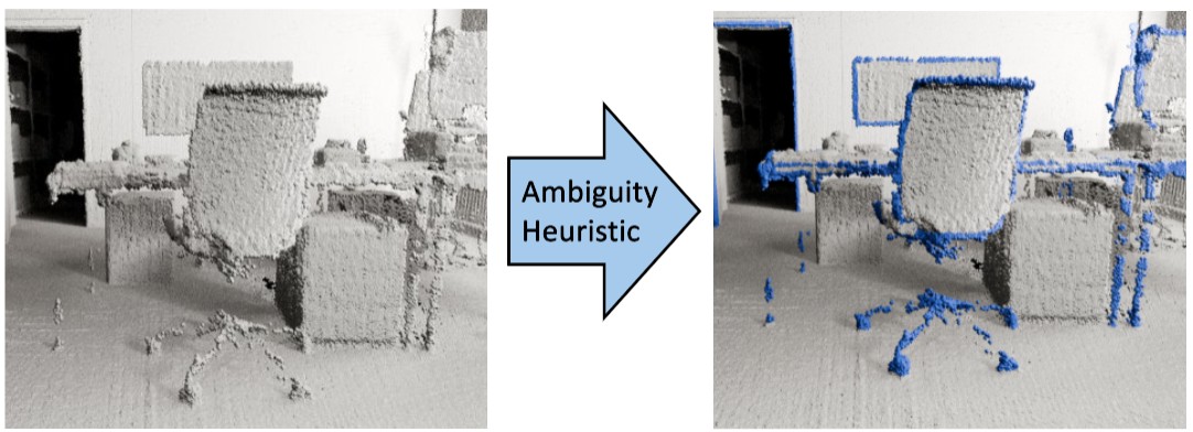 - An analysis of LiDAR artifacts and a novel ambiguity heuristic to identify regions likely adjacent to missing geometry.