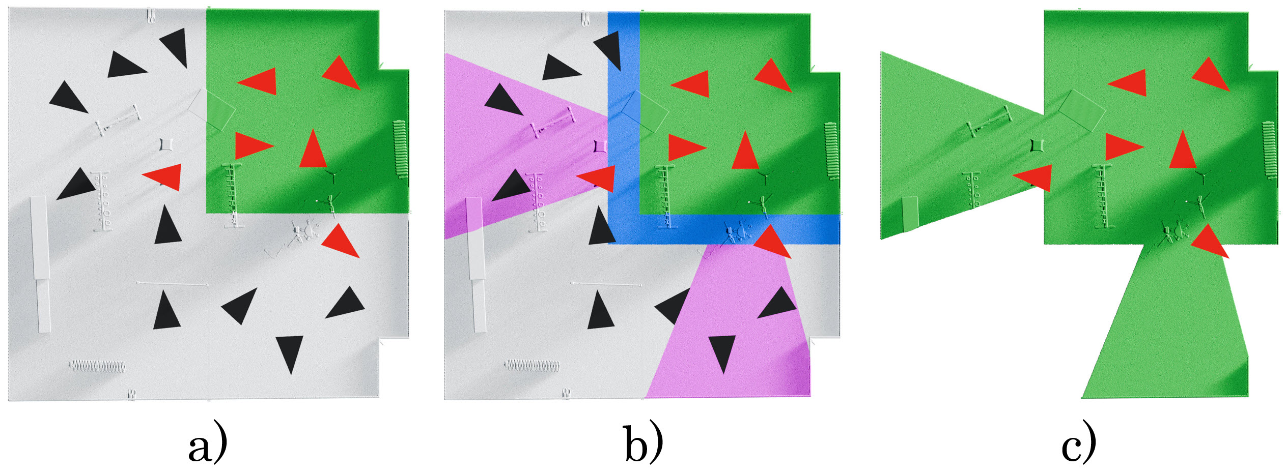a) a chunk (green) selects a subset of cameras (red) inside its bounds or viewing it;