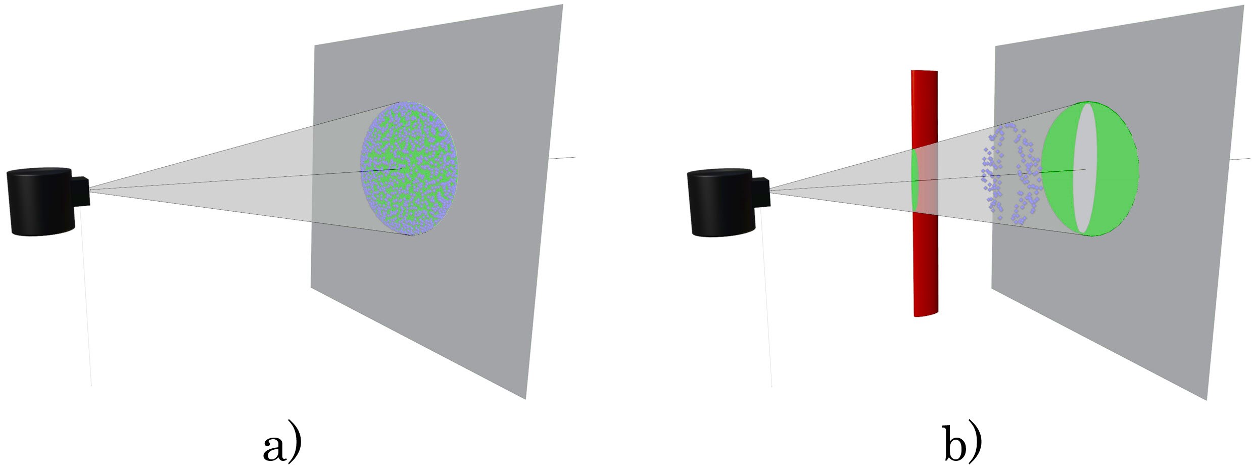Thin structures (red) often fall within a beam's divergence and produce multiple different measurements (green), resulting in averaged samples in between surfaces (blue).