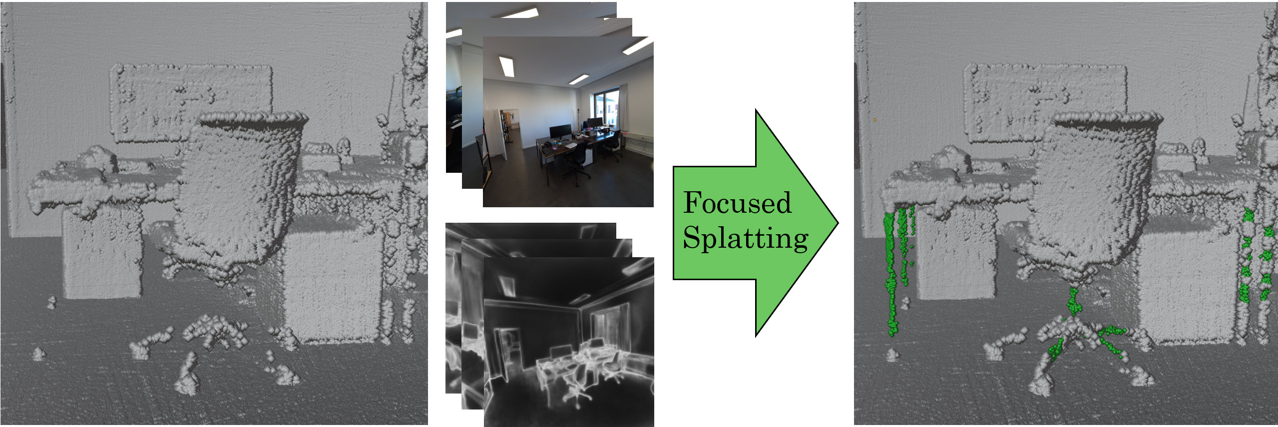 Afterwards, we filter the Gaussian model only for missing areas in the original LiDAR scan and sample additional, synthetic points and combine them with the scan.