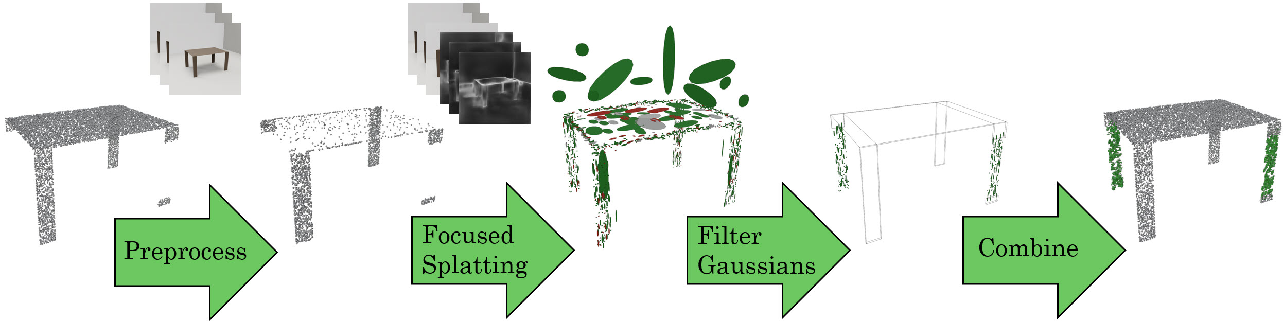 - A procedure that extracts and samples Gaussian primitives to synthesize missing geometry with high fidelity.